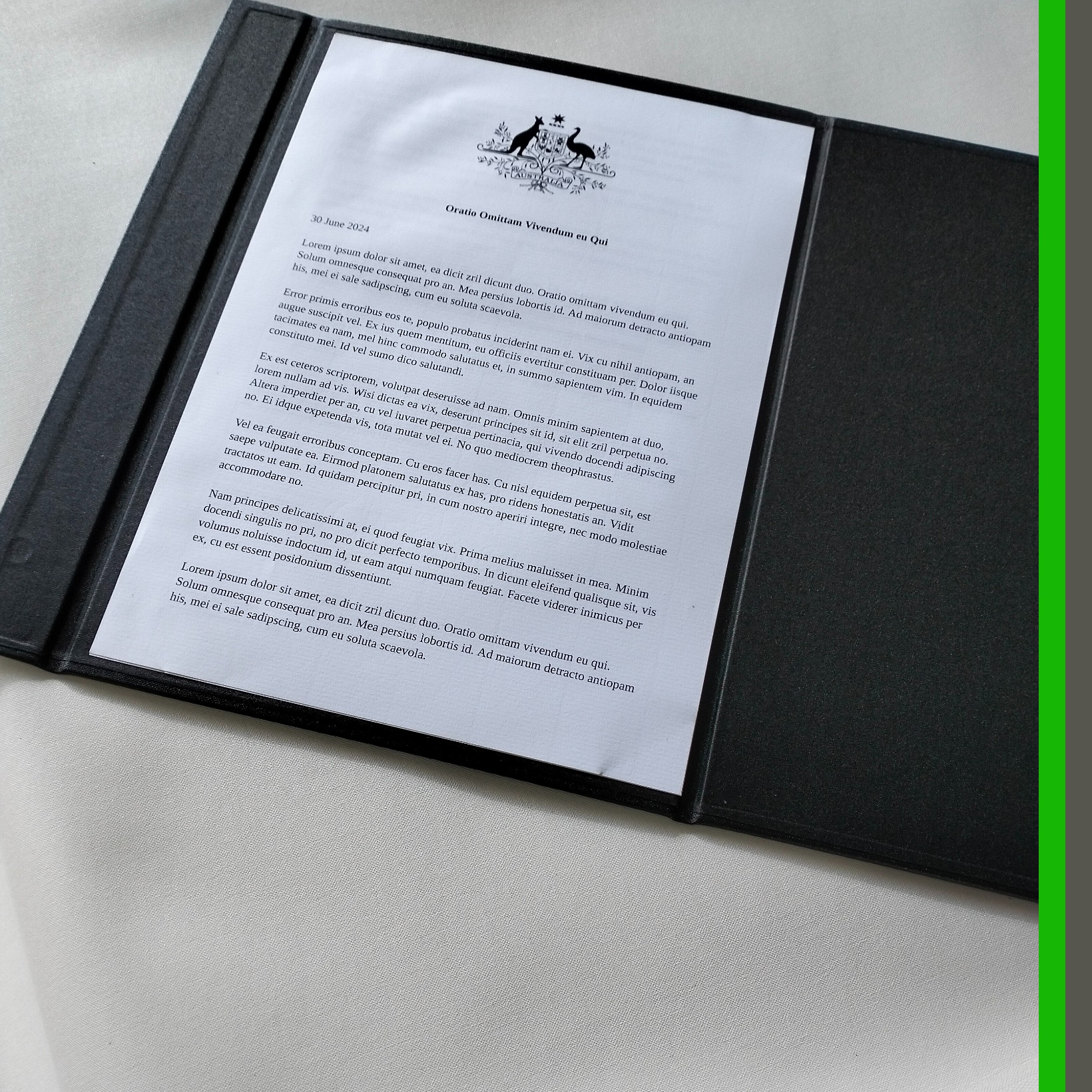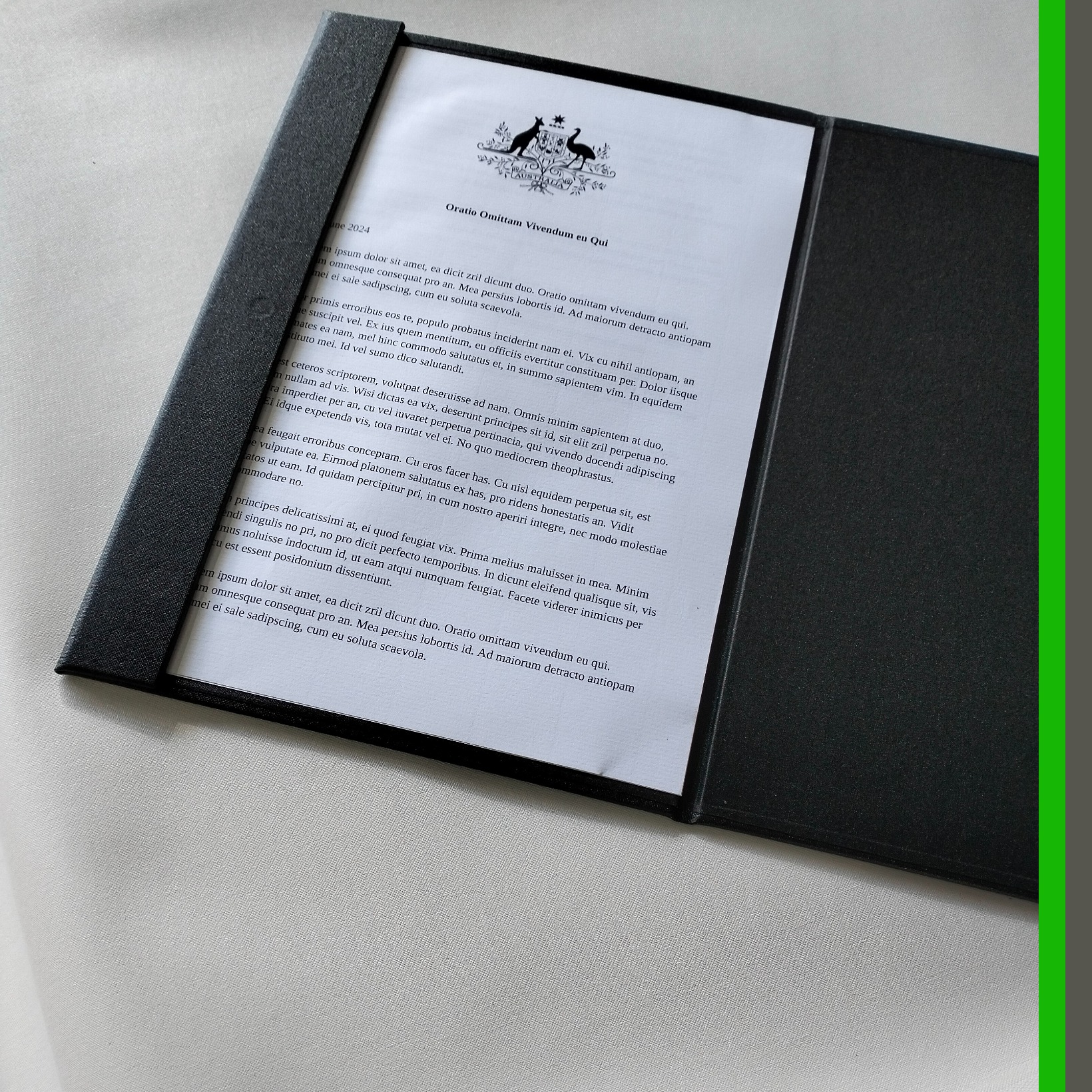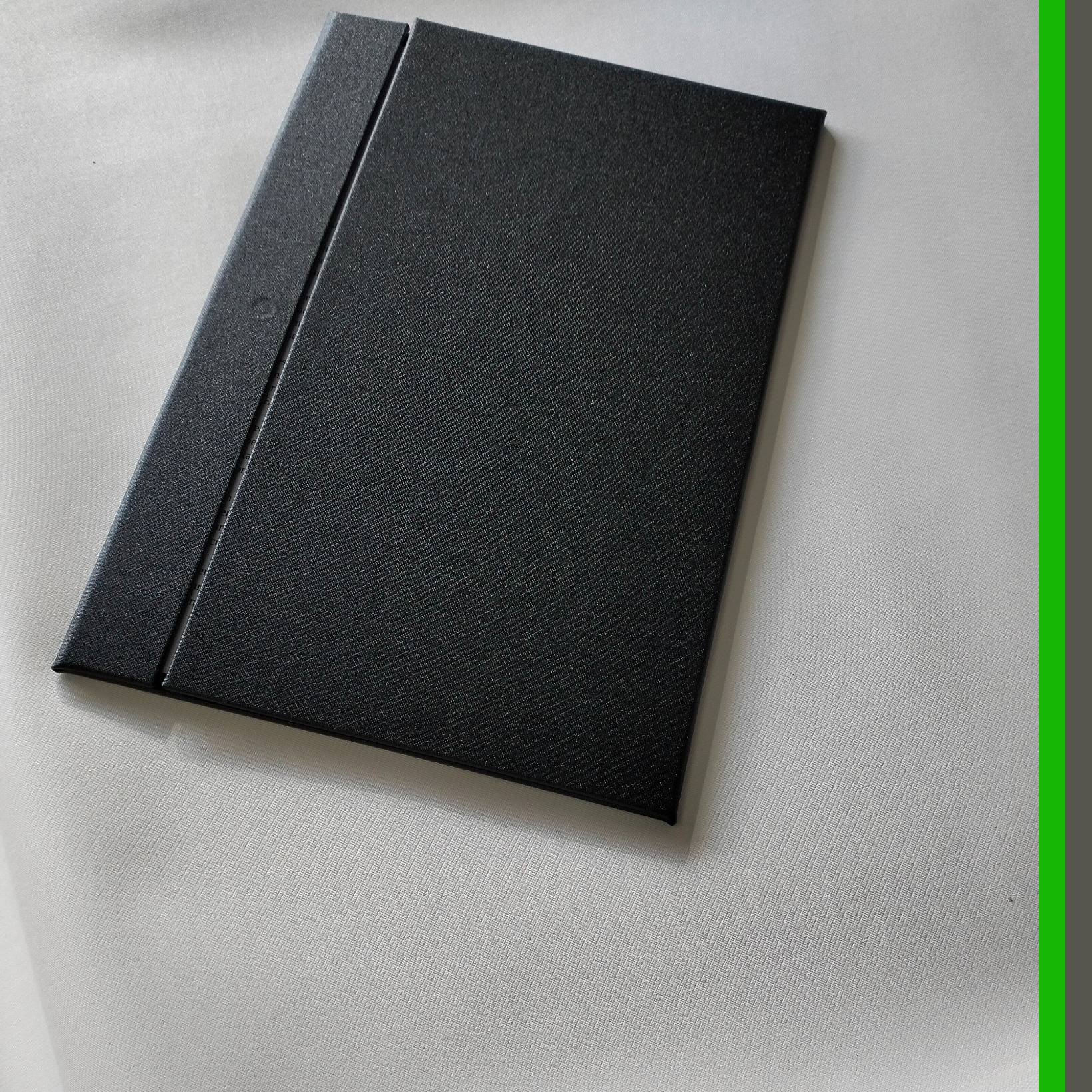 BBAVÂ A prestigious binder that will last for many decades. Magnet binding to clasp up to 12 sheets at 80gsm. Hot stamped with your text on the front panel.